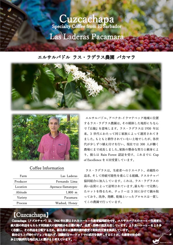 エルサルバドル、アペナカ-イラマテペック地域に位置するラス・ラデラス農園は、その傾斜した地形にちなんで『丘陵』を意味します。ラス・ラデラスは 1930 年以来、3 世代にわたって同じ家族によって運営されてきました。もともと耕作されていない土地でしたが、各世代が少しずつ植え付けを行い、現在では 300 人が働く農場にまで成長しました。家族の懸命な努力と献身により、彼らは Rain Forest 認証を受け、これまでに Cupof Excellence を 4 回受賞しています。